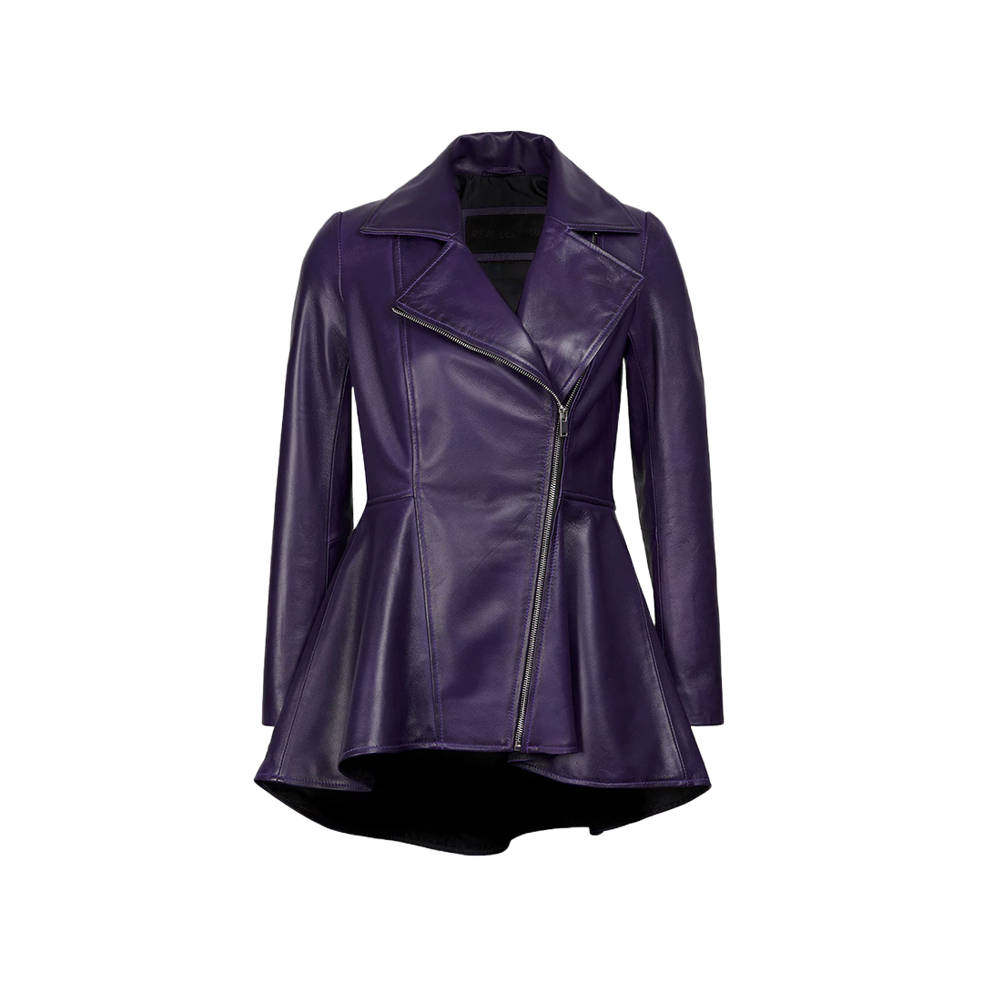 Make a bold yet feminine statement with this Women's Purple Leather Peplum Jacket – a perfect balance of structure and elegance. Designed to enhance your silhouette, it brings modern flair to any outfit, whether you're dressing up for a night out or adding edge to everyday wear.