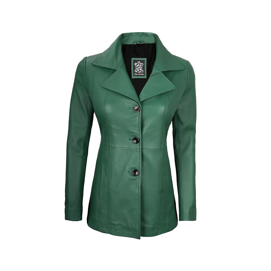 Make a bold style statement with the Women's Green Leather Blazer, a standout piece that redefines modern sophistication. With its eye-catching hue and classic tailored cut, this blazer is perfect for those who embrace fashion with confidence.