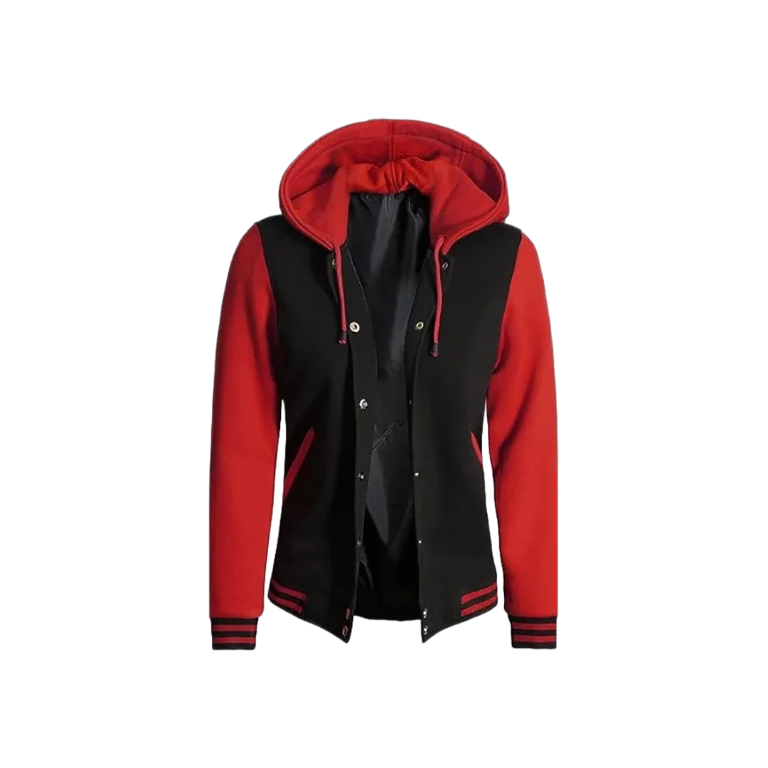 Step up your style game with our Women's Red and Black Varsity Jacket with Hood — a trendy addition to your wardrobe that blends sporty charm with chic appeal. The added hood brings extra warmth and versatility, making it perfect for casual outings, campus days, or cool evenings.
