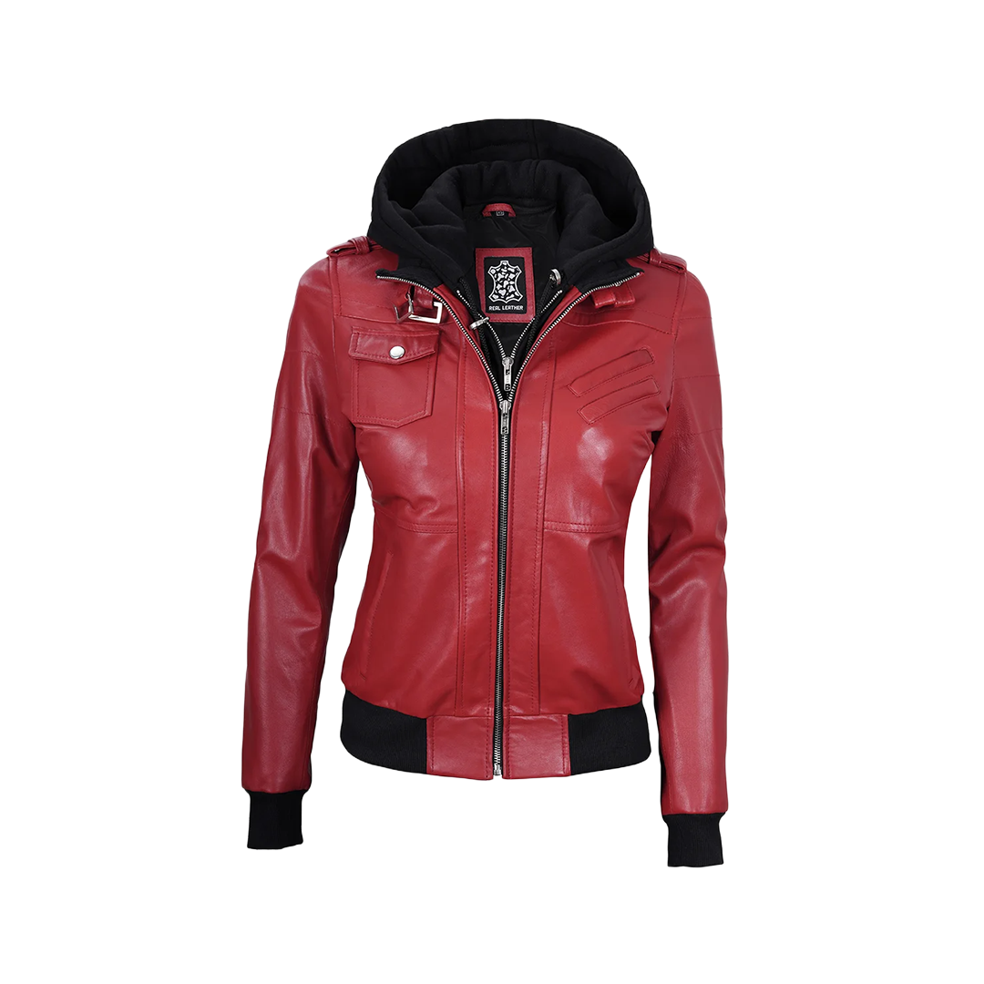 With its daring color and versatile design, the Women's Red Leather Jacket with Removable Hood is your new go-to for standout style and everyday comfort.