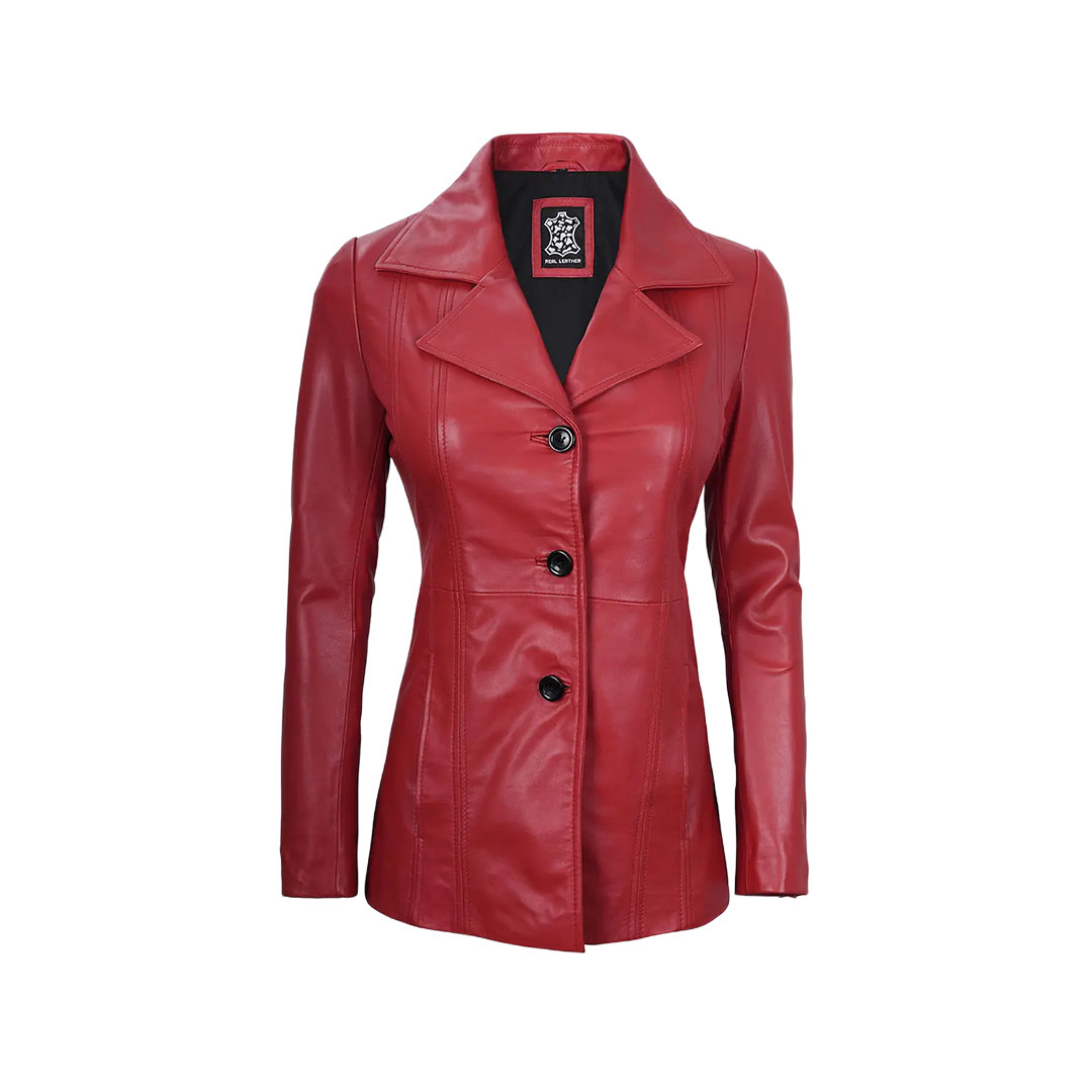 Command attention and express bold confidence with the Women's Red Real Leather Blazer Jacket. Designed to make a lasting impression, this blazer features a classic three-button front and is crafted from 100% real lambskin leather for a luxurious look and feel.
