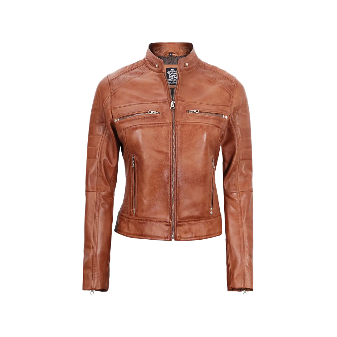 Step into everyday sophistication with the Women's Tan Brown Café Racer Leather Jacket — where classic design meets modern-day utility. Limited pieces available – secure yours now.