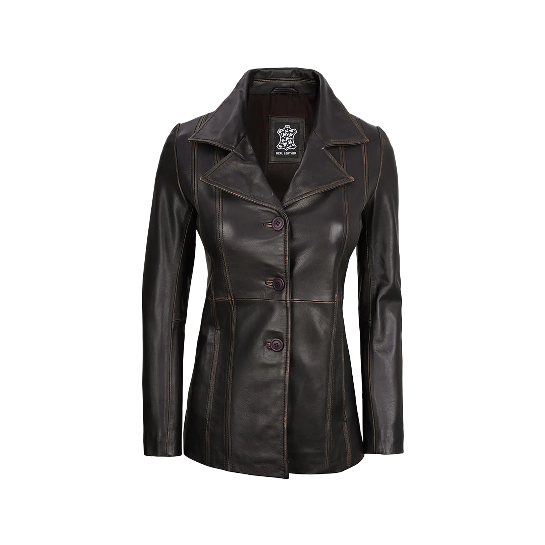 Step into timeless sophistication with our Women’s Three-Button Dark Brown Rub-Off Leather Blazer. Designed for the woman who appreciates refined style with a touch of bold character, this piece blends vintage charm with contemporary tailoring for a standout wardrobe staple.