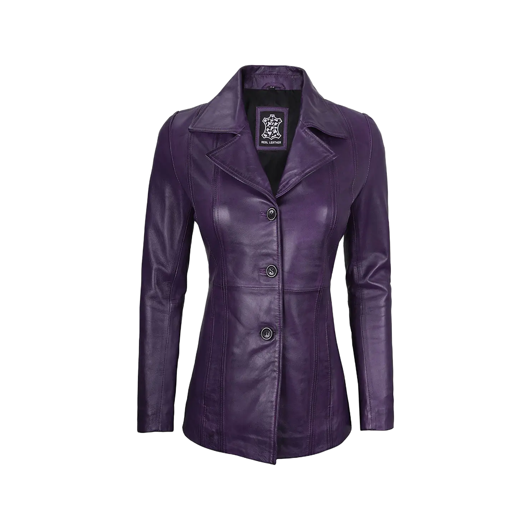 Add a pop of bold sophistication to your wardrobe with the Women's Purple Real Leather Blazer. Designed with a structured three-button closure and a rich purple hue, this blazer is the perfect balance of elegance and individuality—ideal for the modern woman who isn’t afraid to make a statement.