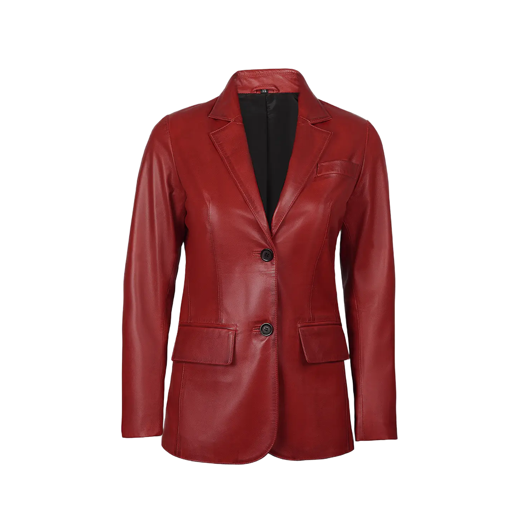 Make a bold impression with the Women's Red Leather Blazer Jacket, a powerful blend of confidence and elegance. Crafted from 100% real lambskin leather, this striking piece is tailored to elevate both your work wardrobe and your weekend looks.