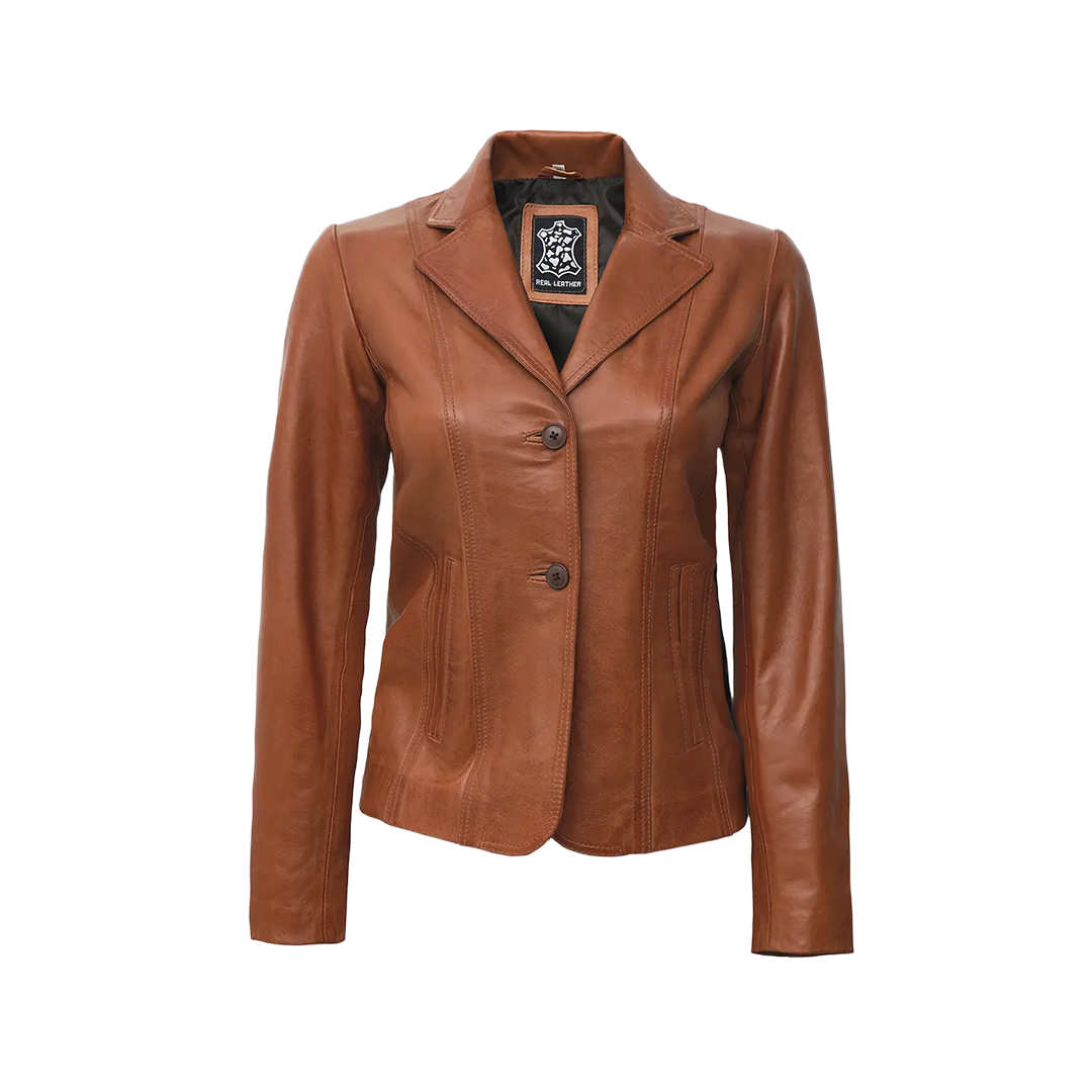 Step up your smart-casual style with this Women’s Two-Button Tan Leather Blazer Jacket, expertly crafted from 100% real lambskin leather. The warm tan finish blends traditional sophistication with modern appeal, making it a must-have layer for workdays and weekends alike.